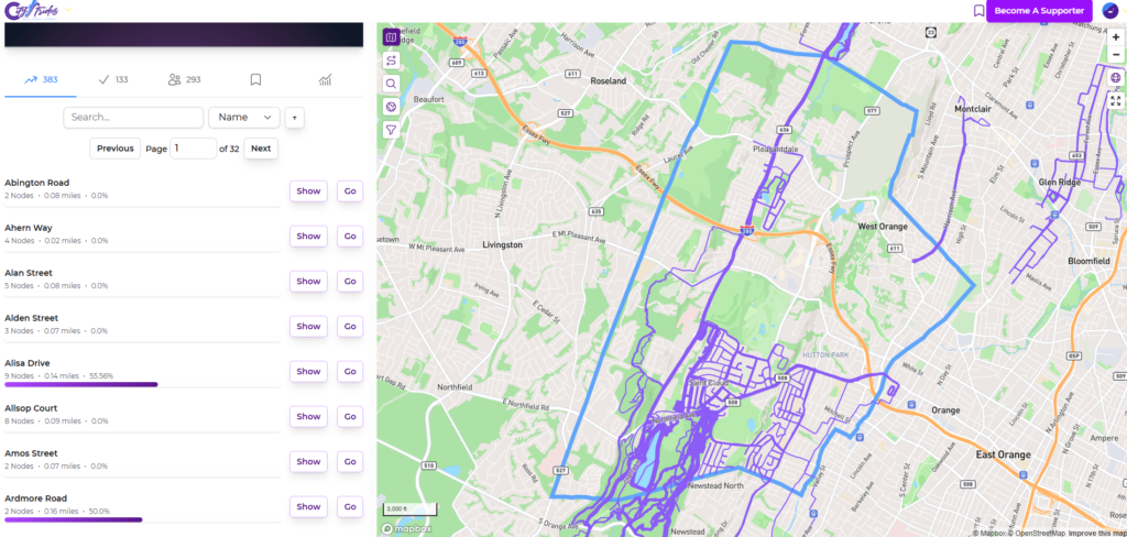 Under the hood, each street has nodes along it’s route. The first time you run through a node, it gets marked as completed. Once each node along a street is completed, the street itself is complete. If you scroll through the list of streets, you can click on “Show” to see the individual nodes and click on “Go” to focus the map on that particular street.